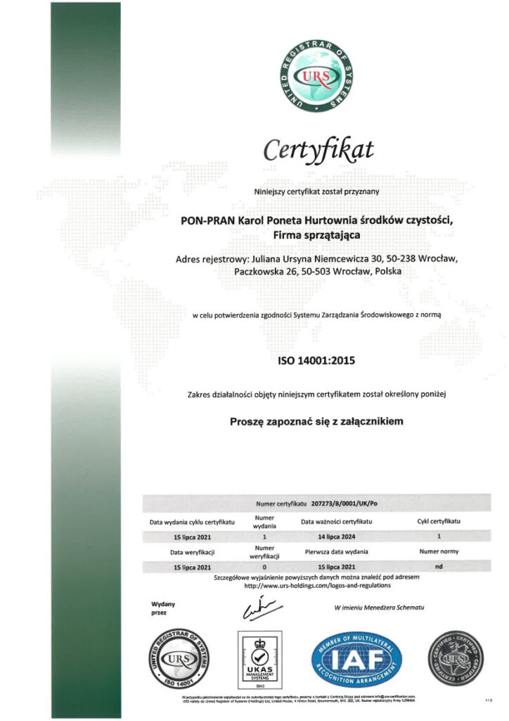 Certyfikat ISO 14001:2015 świadczy o minimalizowaniu przez firmę negatywnego wpływu na środowisko przyrodnicze.
