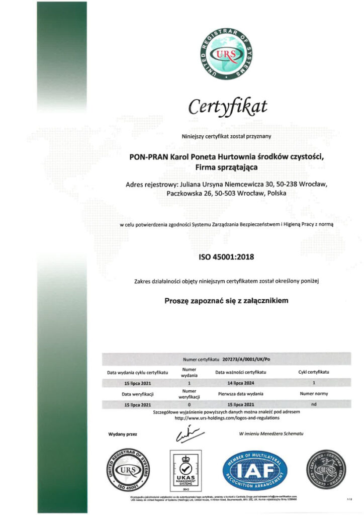 Certyfikat ISO 45001:2018 jest gwarancją zachowywania najwyższej dbałości o bezpieczeństwo i higienę pracy.
