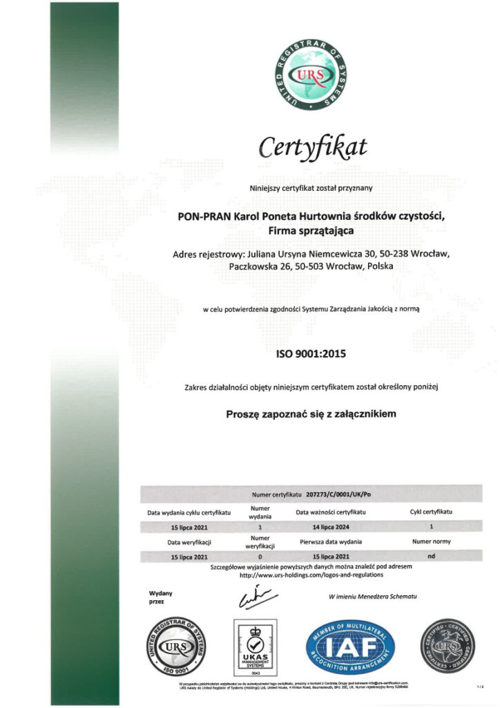 Certyfikat ISO 9001:2015 potwierdza zastosowanie najwyższej jakości obsługi oraz sprawne reagowanie na potrzeby rynku i Klientów.